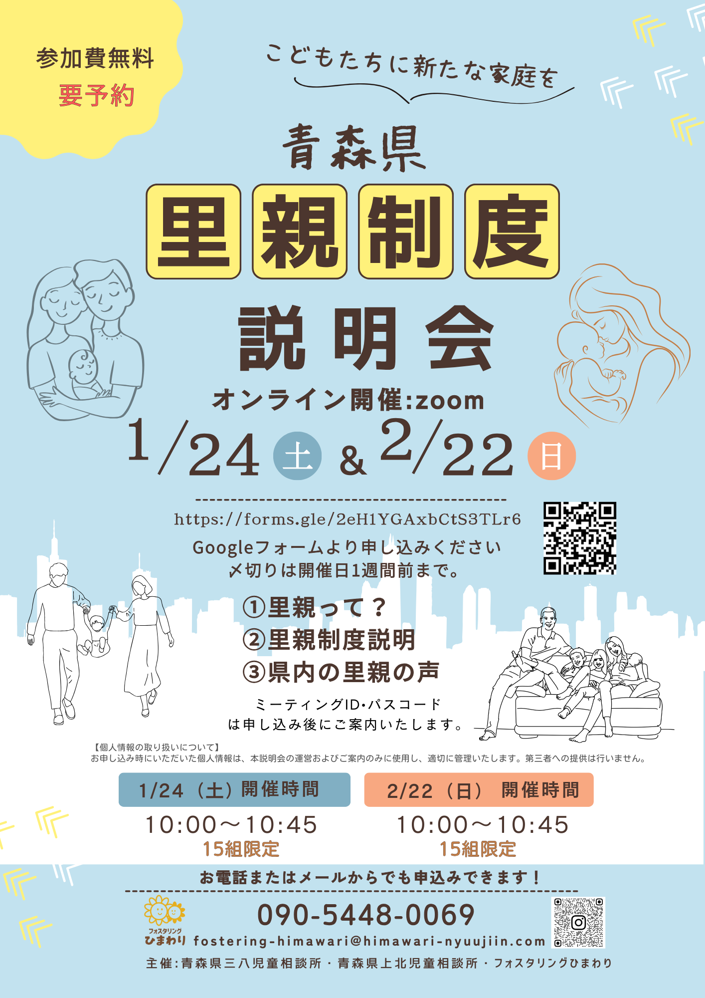青森県里親制度説明会をオンライン(zoom)にて開催いたします。